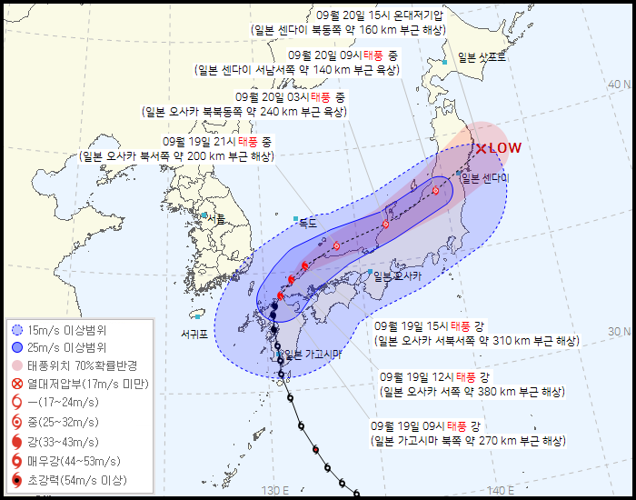 기상청은 태풍 난마돌이 19일 오전 8시 기준 일본 가고시마 북쪽 약260km 육상에서 시속 26km 속도로 북동진하고 있다고 밝혔다. 현재 중심기압은 965hpa, 최대풍속은 초속 37m이다. 현재 태풍과 우리나라와의 거리는 울산이 240km, 포항이 280km 울진은 380km 떨어져 있는데 19일 오전 10시에서 12시 사이가 한반도와는 가장 근접한 시간대가 된다.
